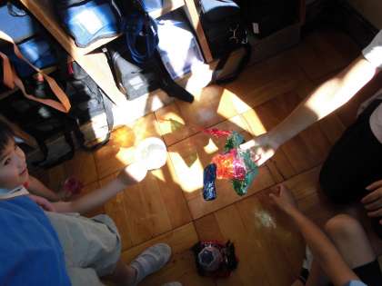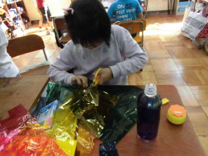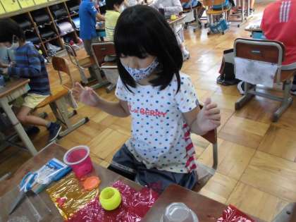 1日(木),図画工作科の学習で光を通す(透明な)入れ物とカラーセロハンを使って