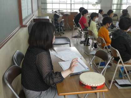 4年生の音楽の授業です。“おつまみ・ふじさん・くだもの”など,班で決めた4文字ことばを いろいろなリズムに乗せて発声します。すると,おっ すごい!楽器がなくても素敵なアンサンブルの出来上がり。