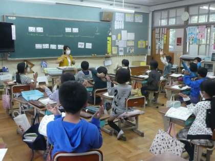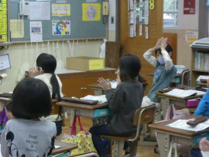3年生の音楽です。指示されたリズムを手拍子で打っていきます。途中 楽譜が空いた部分では,クラスの代表が自分で考えたリズムを打ちます。
