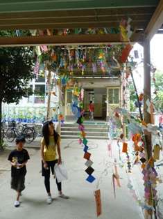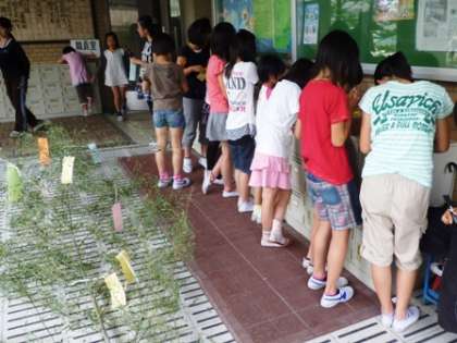 今日、七夕飾りを作りました。午前中は、低学年の子どもたちが、すこやか学級に参加されている地域の方々と一緒に飾りをつくりました。また、昼休みには、他の学年の子どもたちも願い事などを書いて、笹に飾り付けていました。
