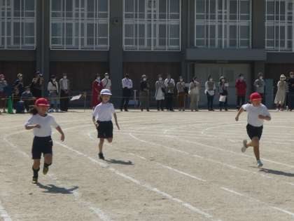 3年生になると,徒競走の距離が延びます。コーナーを含むコースとなるので,走り方にも工夫が必要です。仲間に負けず,ゴールを目指せ!