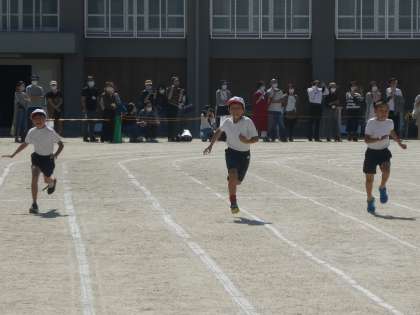 4年生の徒競走は“100M走”。3年生よりも,更に20M距離が長くなります。しっかり膝を上げて,地面を蹴ってダッシュ!