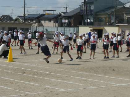 5年生の「バラエティ走」は,頭の上と足の間をボールでつないだあと,仲間の背中を越えて,ボールをドリブル・パス。クラスを半分に分けて,グループ対抗で競いました。