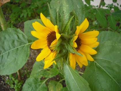 背の高いヒマワリはまだ咲いていませんが,品種改良された背の低いヒマワリが咲いています。
