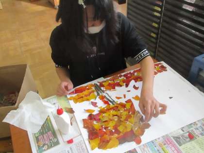ずいぶん気温も下がってきて,学校の敷地内には,赤や黄色に色付いた落ち葉がたくさん落ちています。秋の自然でいろいろ楽しもうという学習で,まずはきれいな落ち葉や木の実・枝などを集めて,それを使って作品作りをしています。