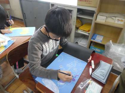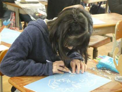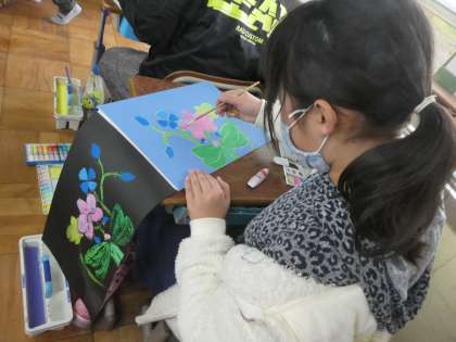 板に花の形を彫り,絵の具で色を付けては 画用紙に写していきます。みんなの作品が教室内で出来上がっていく様子は,さながら“百花繚乱”。なかなかの華やかさです。
