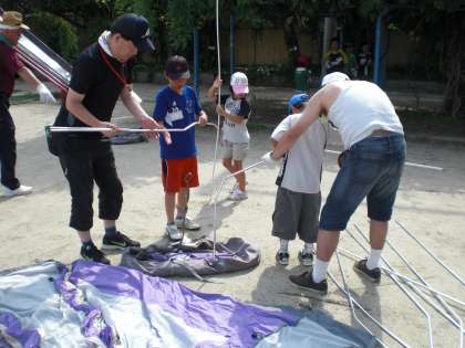 買い物が終わると,各グループが4つのチームに分かれてお泊りの準備をします。テントチームはテントたてのお手伝いをします。とうもろこしチームはとうもろこしの皮むきをしています。