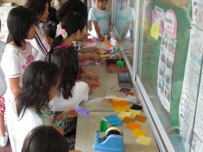 今日から七夕に向けて学校用の笹かざりを作り始めました。玄関前に有志の子どもたちがやってきて,願い事を書いた短冊やきれいな飾りを作り,笹につけていました。この取組は七夕まで続きます。