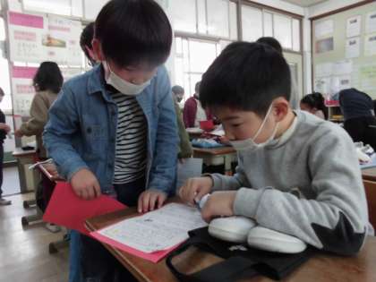 生活科「あそんで ためして くふうして」の学習では1年生を招待するフェスティバルの準備をしてきました。1年生に招待状とスタンプラリーカードを渡しに行きました。
