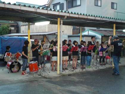待鳳保育園の園児さんに続いて,紫野高校のブラスバンド部による演奏がありました。あいにくの雨で渡り廊下での演奏となりましたが,六甲おろしやAKB48など,みんながよく知っている曲をたくさん演奏してもらいました。