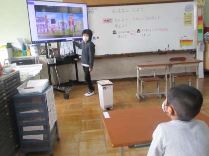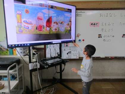 1年生は絵を見てそこから分かることを,5年生は想像力を働かせて,絵に描いていないことまで話をするのがめあてです。