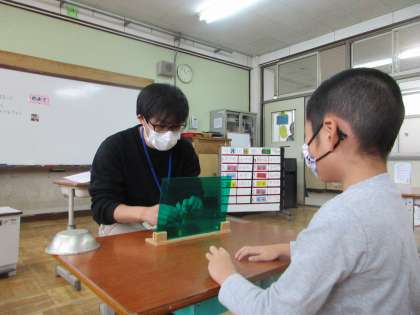 初めは半透明の下敷きの向こう側で増えたり減ったりする積み木の数を答えるのですが,そのうち向こう側が見えない下敷きに変わっていきます。