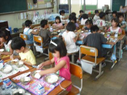 夏休みが終わって,久しぶりの給食です。メニューはこぎつねちらし・平天の煮つけ・小松菜とひじきのいためもの・牛乳です。みんな,「おいしい,おいしい。」と大喜びです。