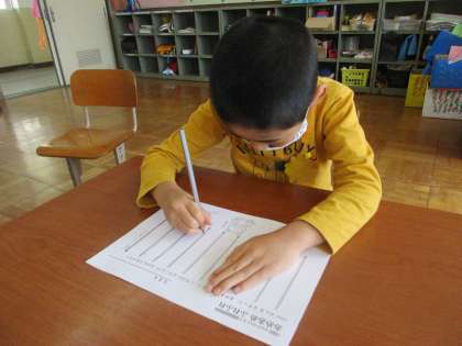 1年生は,運筆の練習。鉛筆の持ち方を確かめながら,直線・波線・丸などのなぞり書きを練習しました。線からはみ出さないようになぞる表情は,真剣そのもの。
