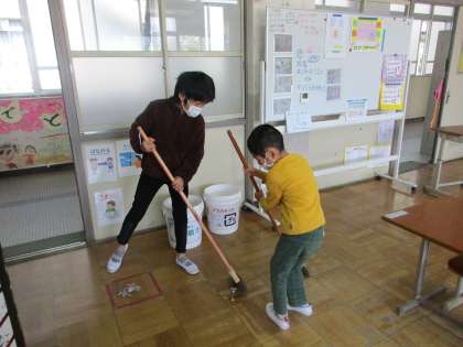 ほうきの上手な5年生。まだまだぎこちないけれど,やる気は満々の1年生。2人でがんばる姿が何とも微笑ましい掃除の時間でした。