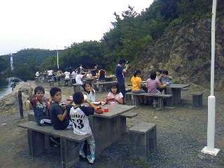 ふたたび今の活動に戻って・・・・・。4年生は夕食です。なんとか雨にも降られずに,海の見える野外での夕食です。