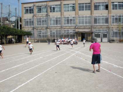 2年生になって80mと走る距離が延びました。1年生の時と違って直線のコースではありません。セパレートコースになります。違うレーンに入らないように練習をしています。