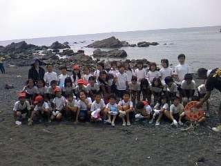 4年生は,宮崎浜での磯観察です。その前にクラスごとに集合写真,はいポーズ!