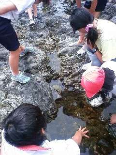 こちらも引き潮の岩場で磯観察です。岩の隙間をよく見ると,いろんな生き物がいます。