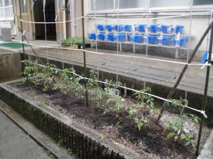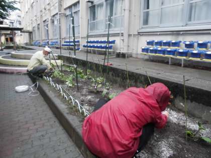 地域の土橋さんが,野菜の苗を植え付けに来てくださいました。苗が大きく育っているので時期を逃しては,良くないと言うことで小雨の中でしたが,担任とともに植え付けました。19日には,2年生の子どもたちも土橋さんに教えてもらった植え方でミニトマトを植えます。