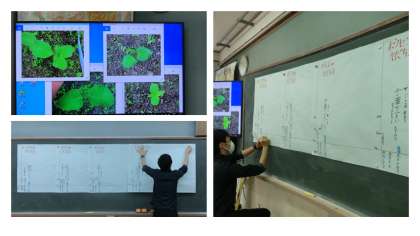 廊下に模造紙を用意し,理科の授業のたびに記録しています。
