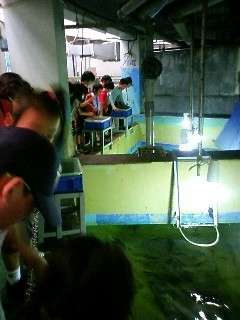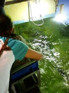 ふだんは見られない水族館のバックヤードに入れてもらい,魚の餌付けをしました。餌を投げると,勢いよく食いついてきます。