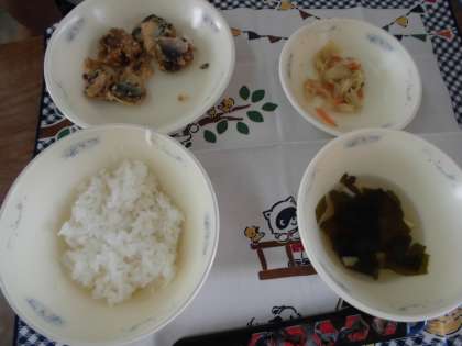 献立は,『ごはん・若竹汁・キャベツのごま煮・いわしのこはくあげ』でした。