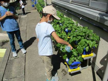 土日にあげられなかった分,1年生はアサガオにたっぷりとお水をあげました。