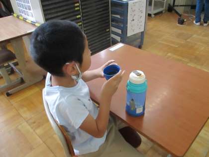 しばらく外にいて暑かったので,教室に戻ってから,水筒のお茶をしっかり飲みました。