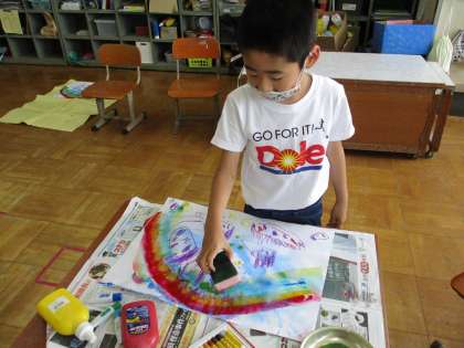 楽しく描いた絵の仕上げに,絵の具をつけたスポンジを,虹の形にスーッと走らせると・・・