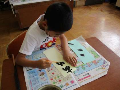鉛筆よりも軽い力でしっかり線が書ける筆が楽しくて,うれしそうに書く1年生。
