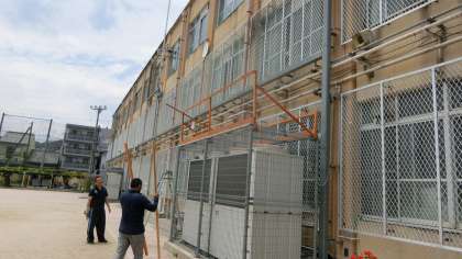 運動場に設置している室外機から出てくる熱風。その熱風が,2階,3階の教室に入っていかないようにするため,室外機の上にカバーを付けています。校長先生と管理用務員の梶原さんとで設置中。今週中には完成させたいです。