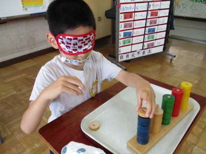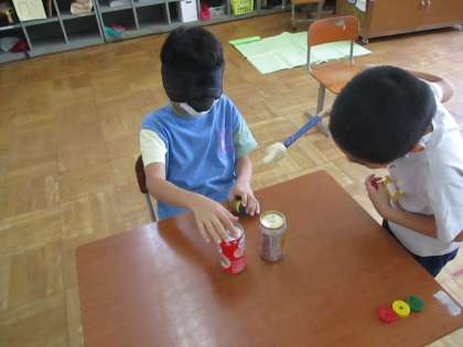アイマスクを着けると,「赤い輪を棒に通す」「席を移動する」など,普段何気なくしている動作が,とても難しかったり怖かったりすることに気づきました。