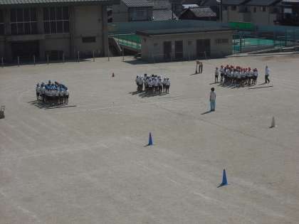 運動会の競技,「台風の目」を練習しています。4人が心を一つにしてうまく回れるかな。