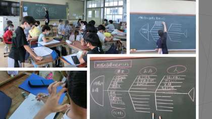 「フィッシュボーン」という思考ツールを使って,待鳳校区の自慢について考えました。たくさん出てきた自慢の中から,これから自分たちが調べ,深めていきたい内容を決定していきます。