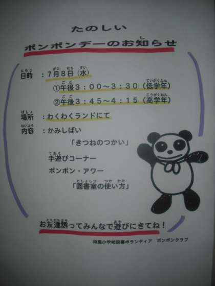 明日,7月8日(水曜日),図書ボランティアさんが「ポンポンデー」を開いてくれます。