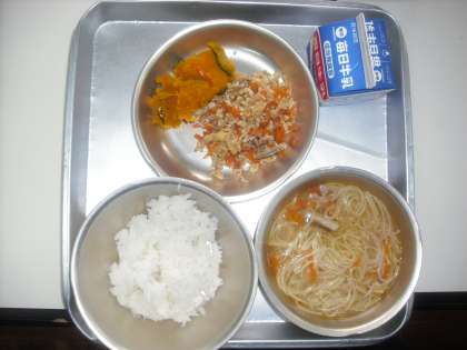 今日の給食のメニューは行事献立(七夕献立)です。天の川にみたてた「七夕そうめん」です。それと,こぎつねちらしとカボチャの煮つけ,牛乳です。こぎつねちらしの具にはみょうがが入っています。今日も残さず,おいしく食べましょう。