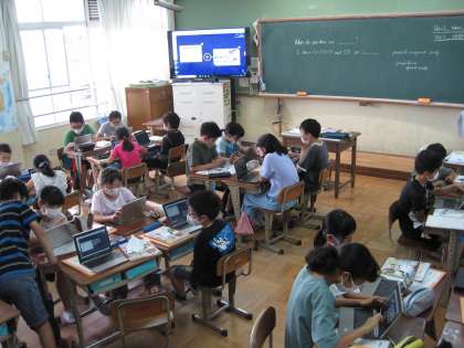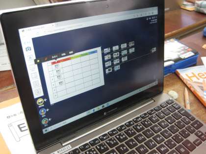 今までの学習でたくさんの教科名を英語で言えるようになった5年生は,今日まとめとしてオリジナルの時間割を作るアクティビティに入りました。GIGA端末を利用し,この曜日には何の教科を入れようかと,グループで考えながら,活動していました。