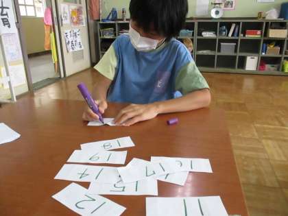 数字カードを見ながら,一生懸命ていねいに日付の数字を書く1年生。