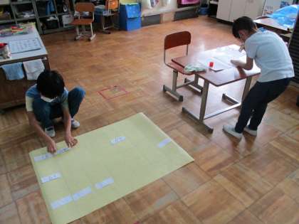 一文字一文字,ていねいに数字を書いて,線にピッタリと合わせて貼り付ける5年生。