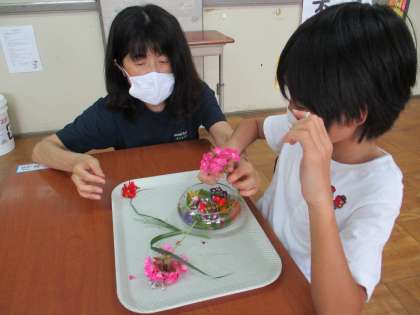 七夕を前に,生け花にチャレンジの2回目を行いました。今回も,にじいろ教室担当教員をゲストティーチャーに迎えて,素敵な作品にチャレンジです。