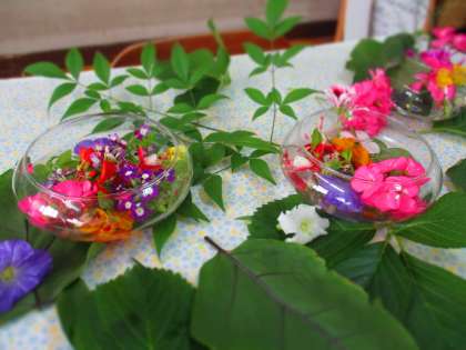 今回も,水を張った器に自分で花を浮かべていきながら,見事作品が完成。
