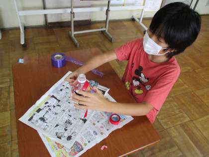 ペンで模様を描いたり,ビニールテープや荷造りひもを貼り付けたりしながら,思い思いに飾り付けを楽しみました。
