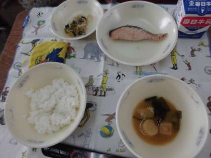 「ごはん・牛乳・さけの塩こうじ焼き・小松菜の切干大根の煮びたし・みそ汁」でした。