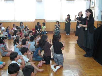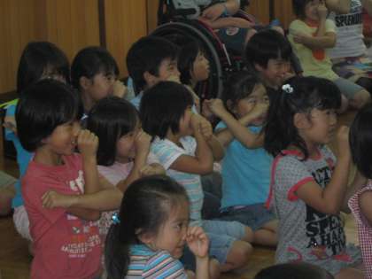 次は手遊びコーナーです。みんな笑顔で手遊びを楽しんでいます。次回の「ポンポンデー」はどんなのかな?楽しみですね。図書ボランティアのみなさん,ありがとうございました。
