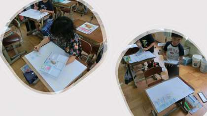 お話の絵をかいています。今日はいよいよ着色に入りました。絵具やコンテ,パスを使って色を付けていきます。楽しみながらがんばっていました。(1組は火曜日に実施します)