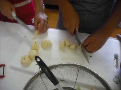 今日は,理科の学習で育てたジャガイモを使って,ごはんとみそ汁の調理実習です。ジャガイモやネギ,おあげをていねいに切っています。