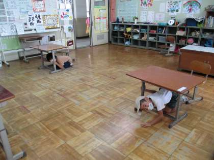 そこで,京都でもいつ起こるかわからない「その時」に備えて,先日の避難訓練を思い出しながら,緊急地震速報の音を聴いて,素早く身を守る練習を行いました。