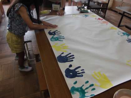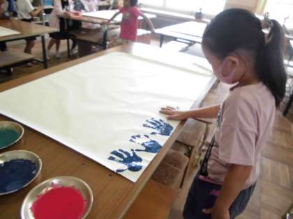 Teamsでアンケートをとり,決まった児童会のスローガンを全校で製作していきます。スローガンの文字のまわりに全校の手形で飾っていきます。子どもたちは,どの色で手形をつくろうかな・・・と考えながら楽しそうに写していました。