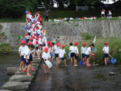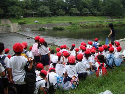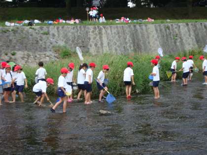 賀茂川へ生き物さがしに出かけました。昨日の予定でしたが,雨のため中止。梅雨の合間をぬっての実施です。今日は鴨川の水量も少なく,とても楽しみにしていた子どもたちは大喜びです。
